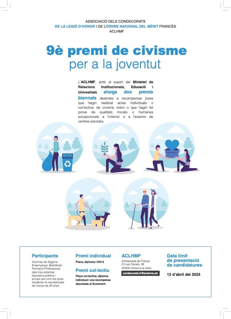 L’Associació dels Condecorats de la Legió d’Honor i de l’Ordre Nacional del Mèrit Francès organise le Prix de Civisme pour la Jeunesse avec le soutien du Ministère de l'Éducation et de l 'Enseignement Supérieur d'Andorre.